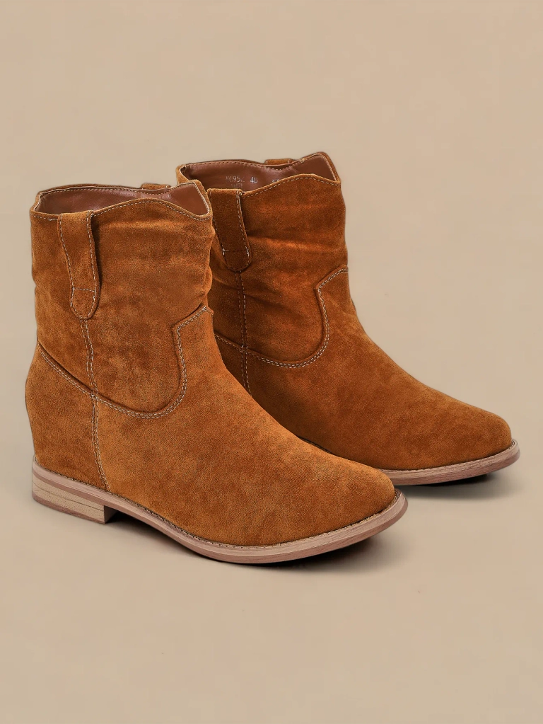- Ботинки в ковбойском стиле на скрытой низкой танкетке. Изготовленные из эко-замшевой кожи. Обувь без застежек, внутри имеет мягкую меховую стельку. Подойдут ко многим женственных образов.