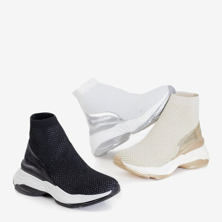 - Женские высокие кроссовки. Модель выполнена из тканевого материала с блестящей нитью, на тыльной стороне имеется вставка из лакированной экокожи. Стелька обшита экологической кожей. Они подходят ко многим повседневных стилизаций.