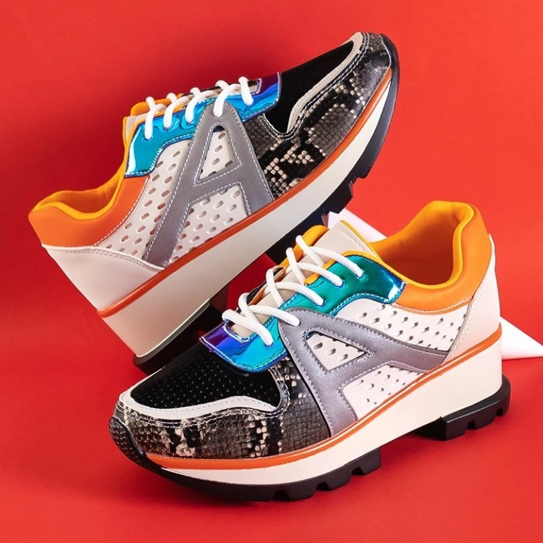 - Яркая женская спортивная обувь на массивной оригинальной подошве. Верх изготовлен из экологической кожи с перфорацией. Модель оснащена голографическими вставками и элементами, имитирующими змеиную кожу.
