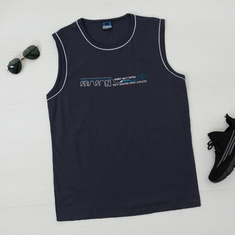 - Мужская спортивная майка. Изготовлена из 100% хлопка. Спереди модель украшена надписями. Отличный выбор для активного времяпрепровождения!