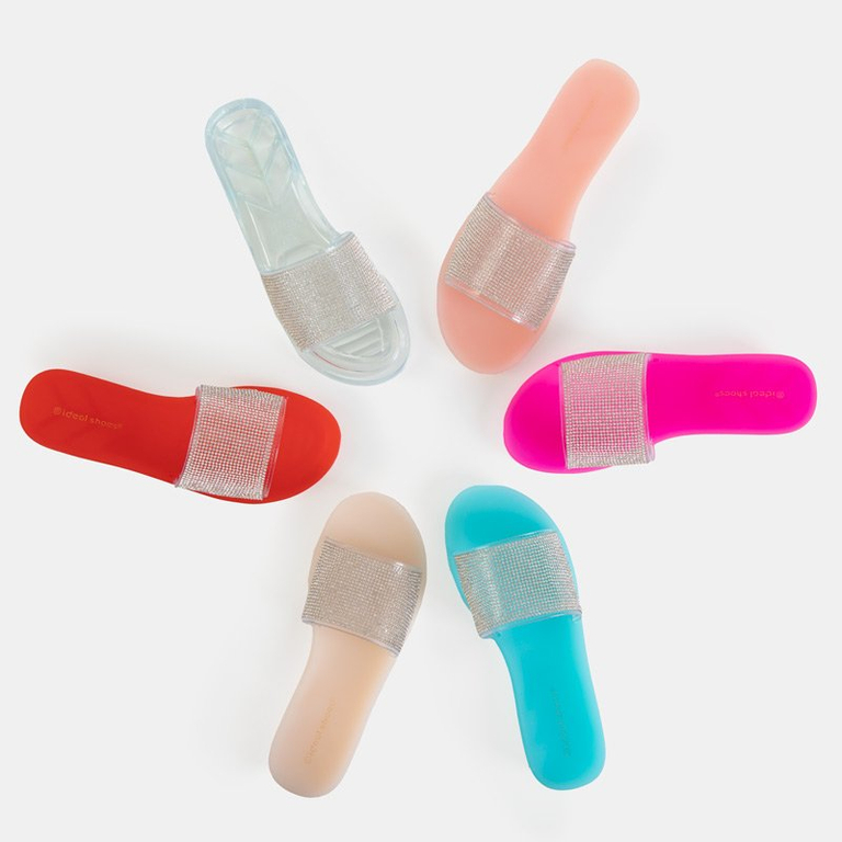 - Женские шлепанцы на плоской каблуке, полностью изготовленные из резинового материала. Прозрачный ремешок, украшенный маленькими стразами. Удобная обувь на лето!