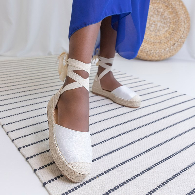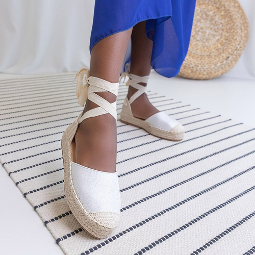 - Легкие женские эспадрильи из ткани со стелькой из экокожи. Модель завязана вокруг щиколотки, подошва украшена плетеной тесьмой, носок с блестками. Идеально подходит для юбок! ПРИМЕЧАНИЕ: модель предпочтительна для людей с узкой анатомией стопы.