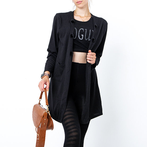 - Длинный женский кардиган из эластичного материала. Имеет два кармана и украшенный аккуратными помпонами. Комфортная модель, которая станет любимым элементом гардероба в холодные дни.