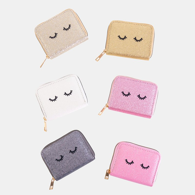 • Волшебный кошелек с экологической кожи с блестящим покрытием, украшенный вышитыми ресницами. Застегивается на молнию. Модель имеет: