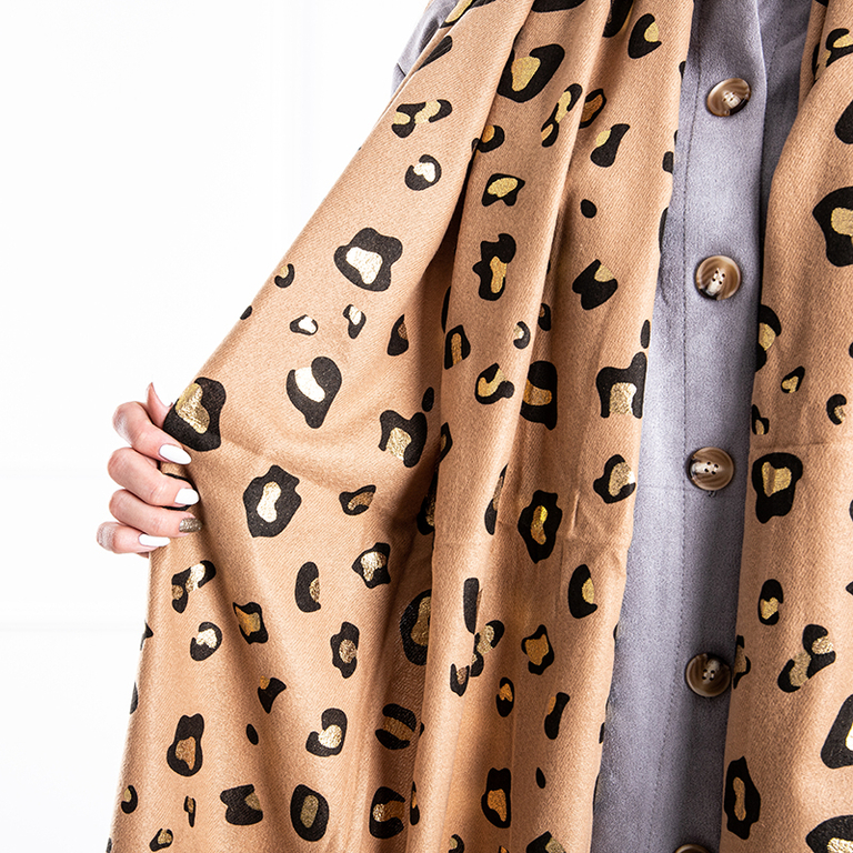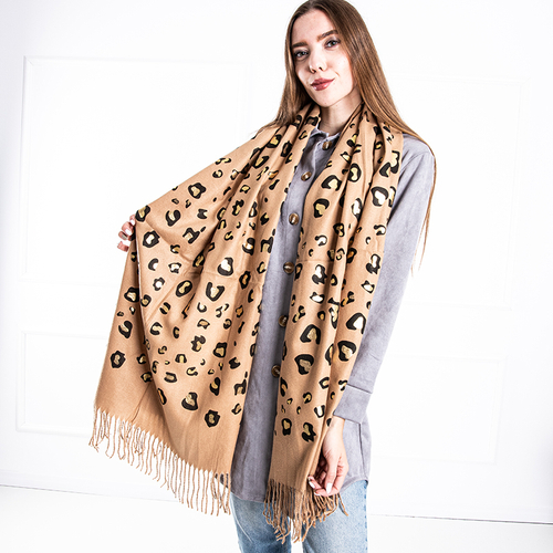 - Красивый женский теплый шарф, идеально подходящий для осени и зимы. Украшены золотыми вставками и кисточками по бокам.