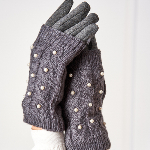 - Теплые женские перчатки из мягкой ткани. Сверху имеют съемную трикотажную накладку, украшенную жемчугом. Внутри меховая подкладка. На большом и указательном пальцах есть нашивка, что позволяет работать с сенсорными экранами.