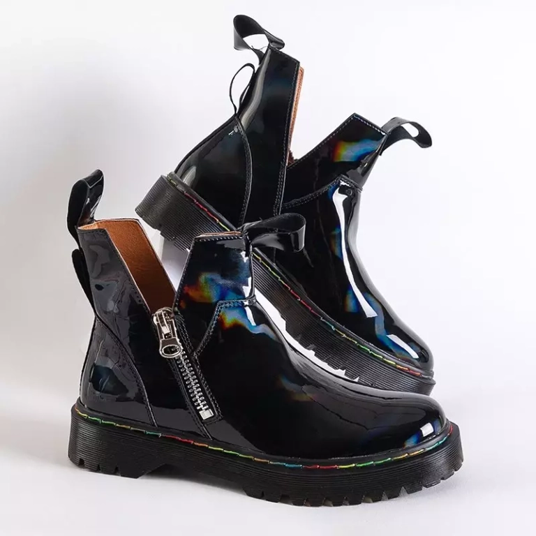 - Женские сапоги из комбинации каучукового материала и экокожи с голографическим узором. Модель без утеплителя, стелька внутри обшита экокожей. Вырезы сбоку и застежка-молния. Примечание: в изделии есть сломанный материал.