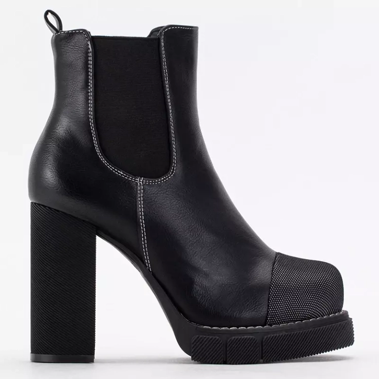- Сапоги женские черные на высокой стойке, модель из экокожи. Носок отделан тканью, стелька также тканевая, обувь без застежки. Примечание: изделие имеет следы клея на материале.
