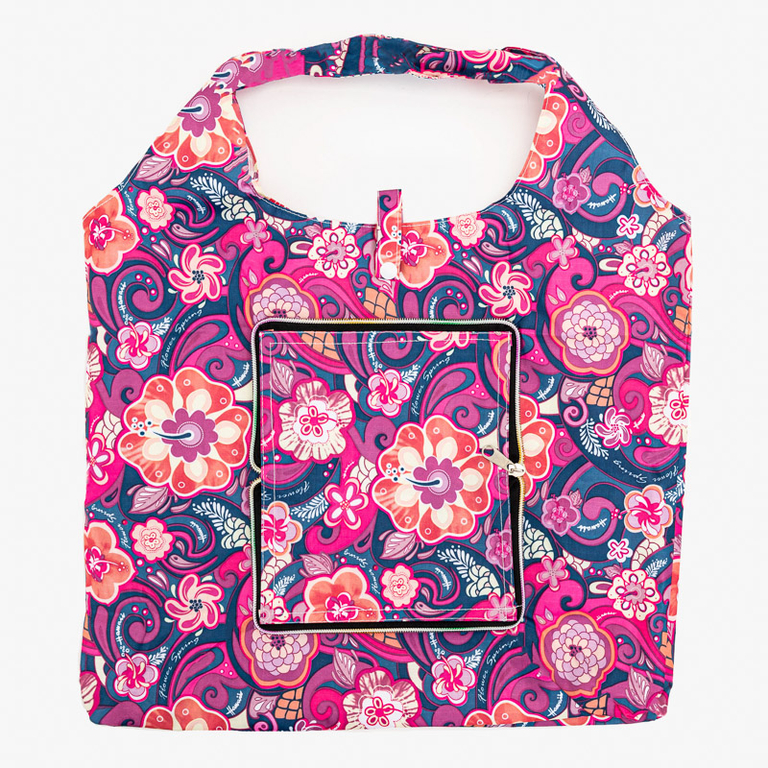 - Сумка для покупок из ткани, которую можно сложить и закрыть на молнию. Изделие с одним дополнительным карманом и кнопкой.
