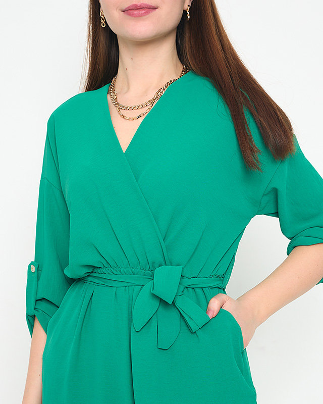 - Модный женский комбинезон с длинными расклешенными рукавами. Ноги прямые и широкие, вырез горловины - серапе с конвертом спереди. Талия с эластичной лентой и декоративной вязкой. ПРИМЕЧАНИЕ: Точность измерения (+/-) 1 см.
