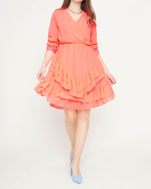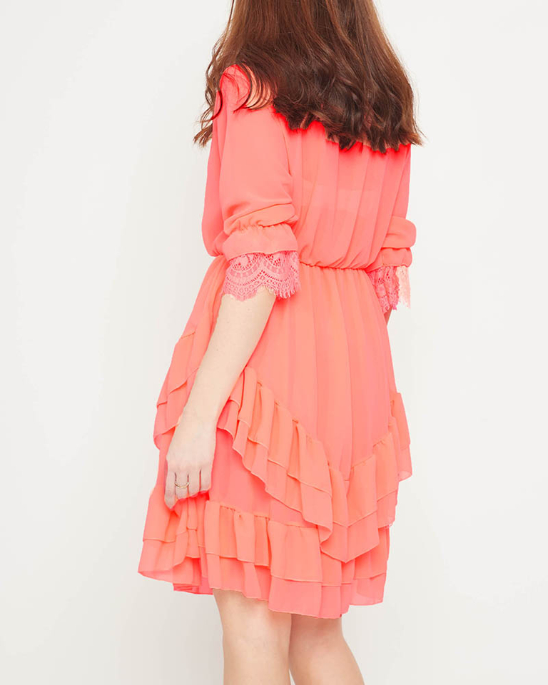 - Фантастическое женское мини-платье. Модель с V-образным вырезом имеет рукава 3/4, отделанные кружевом. Легкое летнее платье украшено воланами, имеет подкладку и пришитую резинку на талии. ПРИМЕЧАНИЕ: Точность измерения (+/-) 1 см.