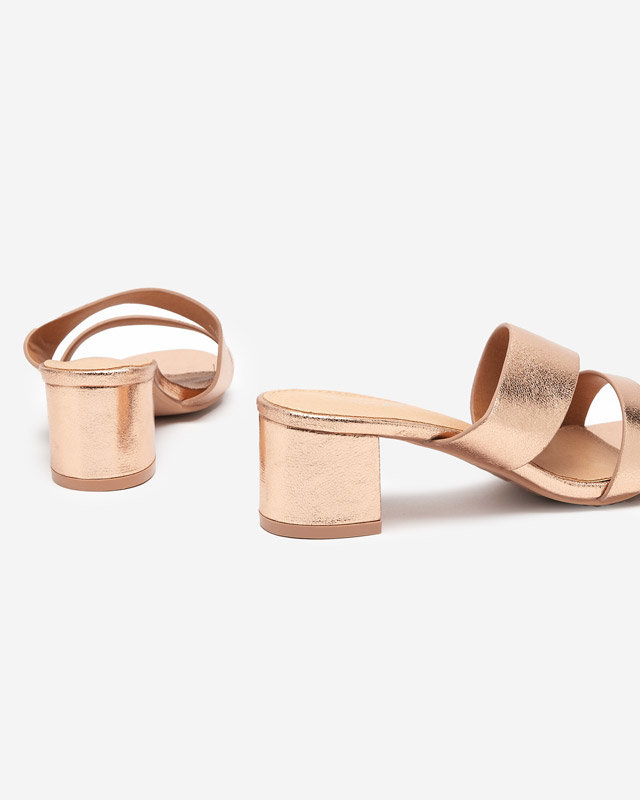 - Красивые женские босоножки из экологической кожи. Модель в красивом золотисто-розовом цвете. Тапочки имеют низкий каблук. Оригинальная обувь, которая подойдет ко многим стилям!