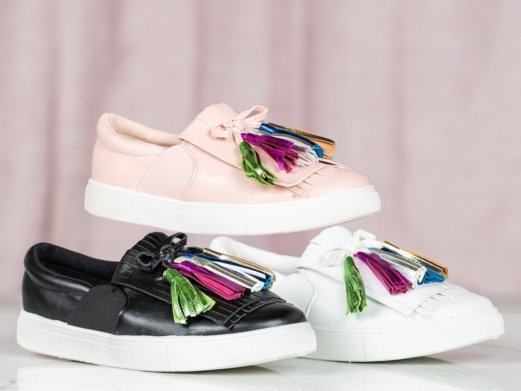 • Спортивные слипоны из экологической кожи. Внутренняя часть обуви обшита тканью. Верх украшен разноцветными кисточками. Идеально подходит для многих повседневных укладок. Примечание: продукт имеет грязь на материале.