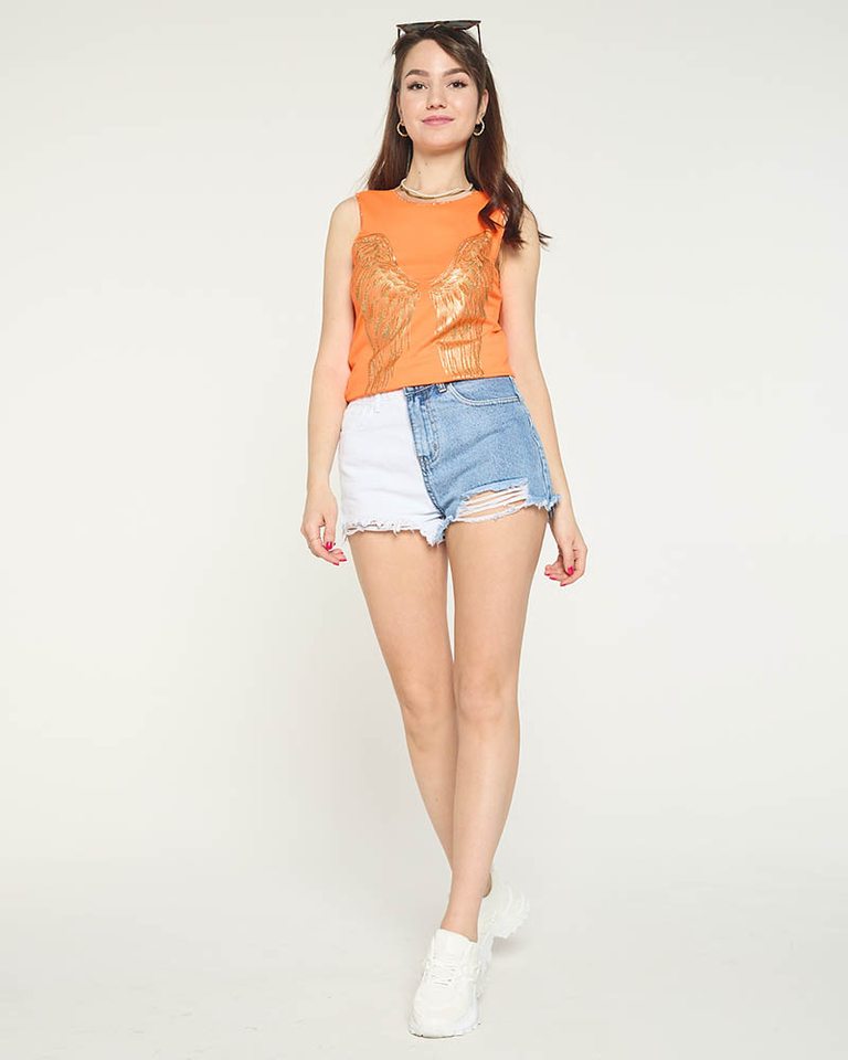• Топ на бретелях из эластичного материала. Золотой принт спереди - крылья. Круглый вырез. ПРИМЕЧАНИЕ: Точность измерения (+/-) 1 см.