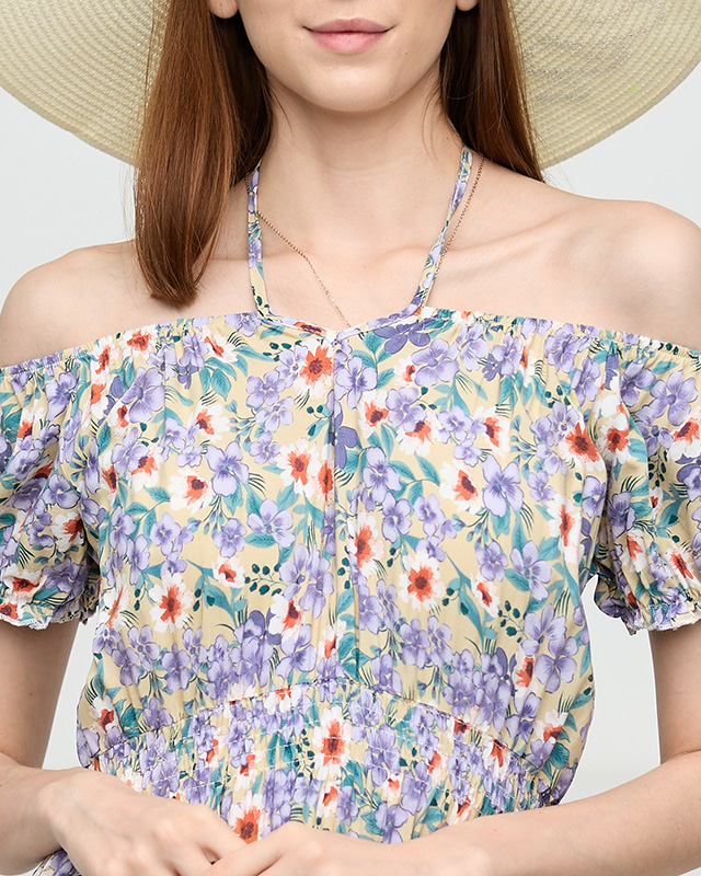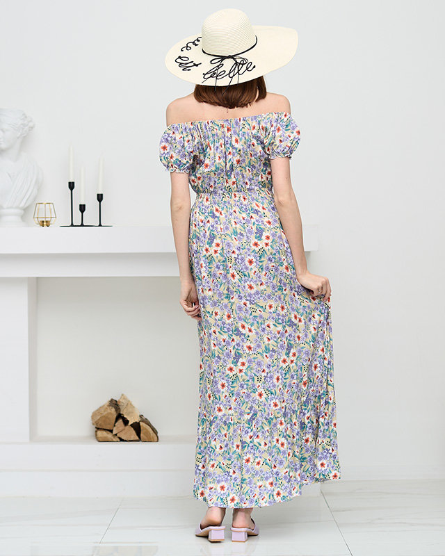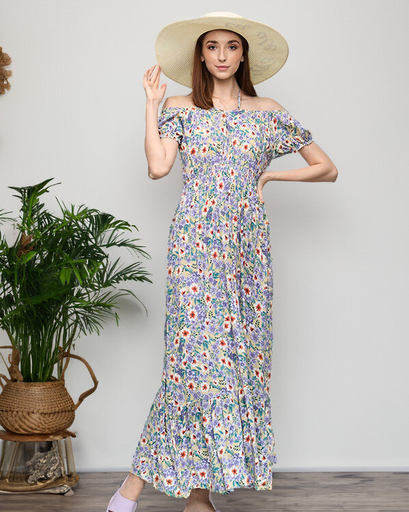 - Воздушное женское макси-платье с нежным цветочным узором. Изготовлен из тонкой хлопчатобумажной ткани. Модель с короткими рукавами и круглым вырезом горловины, имеет резинку на талии и рукавах. ПРИМЕЧАНИЕ: Точность измерения (+/-) 1 см.