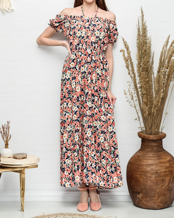 Длинное темно-синее женское платье с коралловыми цветами - Одежда