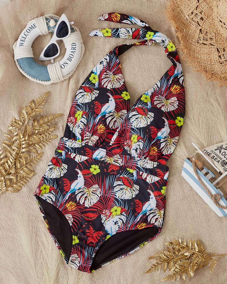 • Слитный женский купальник с экзотическим растительным орнаментом, чашечками с подкладкой и завязкой на шее. ПРИМЕЧАНИЕ: Точность измерения (+/-) 1 см.