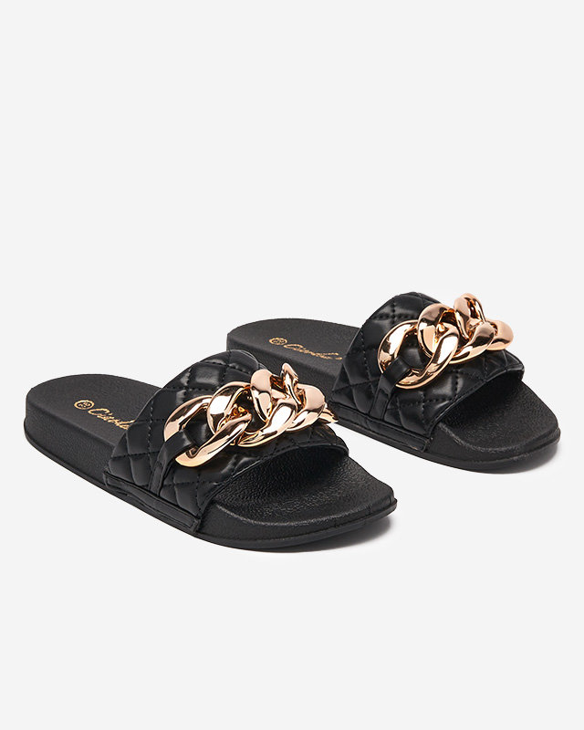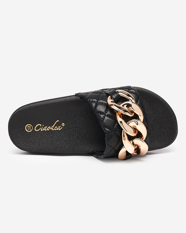 - Стильные женские тапочки из экологической кожи, имеют стеганый верх с золотым орнаментом на ремешке. Модель на плоской и резиновой подошве. ВНИМАНИЕ: модель может иметь царапины на золотом орнаменте.