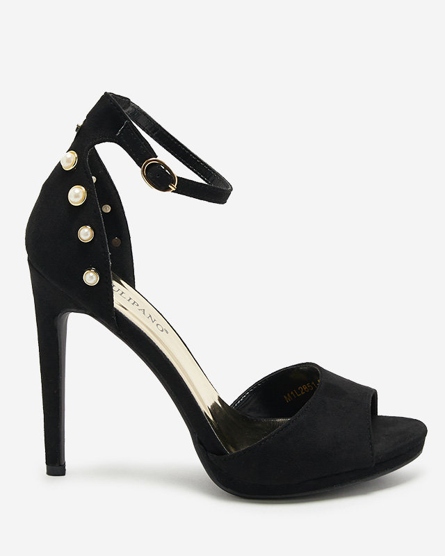 - Классические женские босоножки на высоком каблуке из экологической замши. Регулируемый ремешок вокруг щиколотки застегивается на пряжку. Обаяния им придают декоративные жемчужины на спине. Идеально подходит для брюк и платьев!