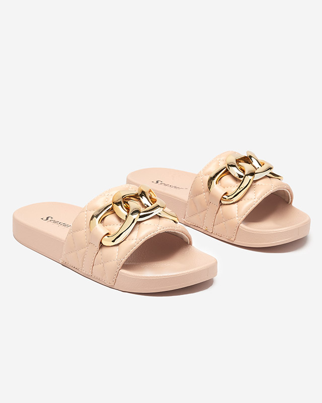 Royalfashion Бежевые женские стеганые шлепанцы с золотой цепочкой Eteris