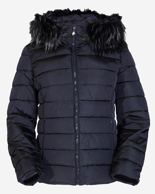 Темно-синяя женская стеганая куртка с капюшоном и мехом