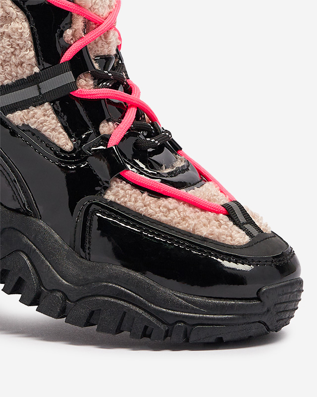 Черные женские спортивные кроссовки с мехом и неоново-розовыми шнурками Adbo- Footwear