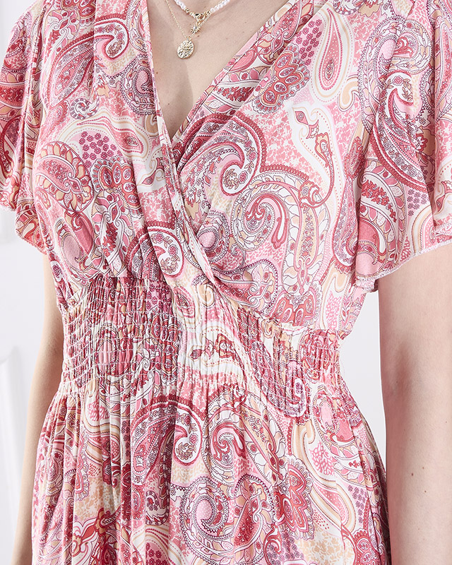 - Стильное женское платье, выполненное из мягкой и воздушной ткани с интересным рисунком. Модель с вырезом-конвертом, имеет эластичный пояс и короткие рукава. Отличный выбор для лета! ПРИМЕЧАНИЕ: Точность измерения (+/-) 1 см.
