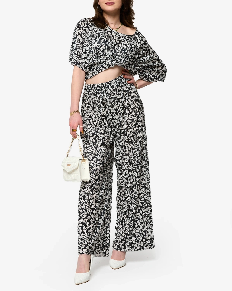 - Женский цветочный комплект, выполненный из скользкой плиссированной ткани. Блузка с круглым вырезом имеет короткие рукава. Брюки-палаццо с широкой горжеткой на талии и декоративными завязками. ПРИМЕЧАНИЕ: Точность измерения (+/-) 1 см.
