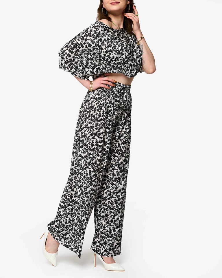 - Женский цветочный комплект, выполненный из скользкой плиссированной ткани. Блузка с круглым вырезом имеет короткие рукава. Брюки-палаццо с широкой горжеткой на талии и декоративными завязками. ПРИМЕЧАНИЕ: Точность измерения (+/-) 1 см.