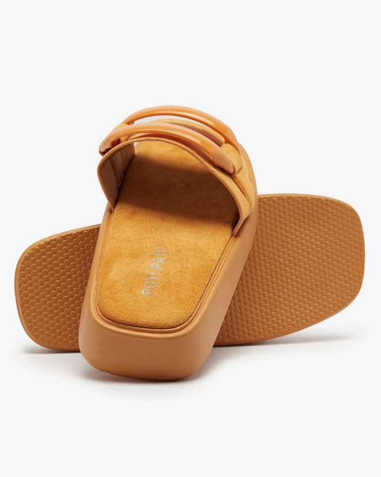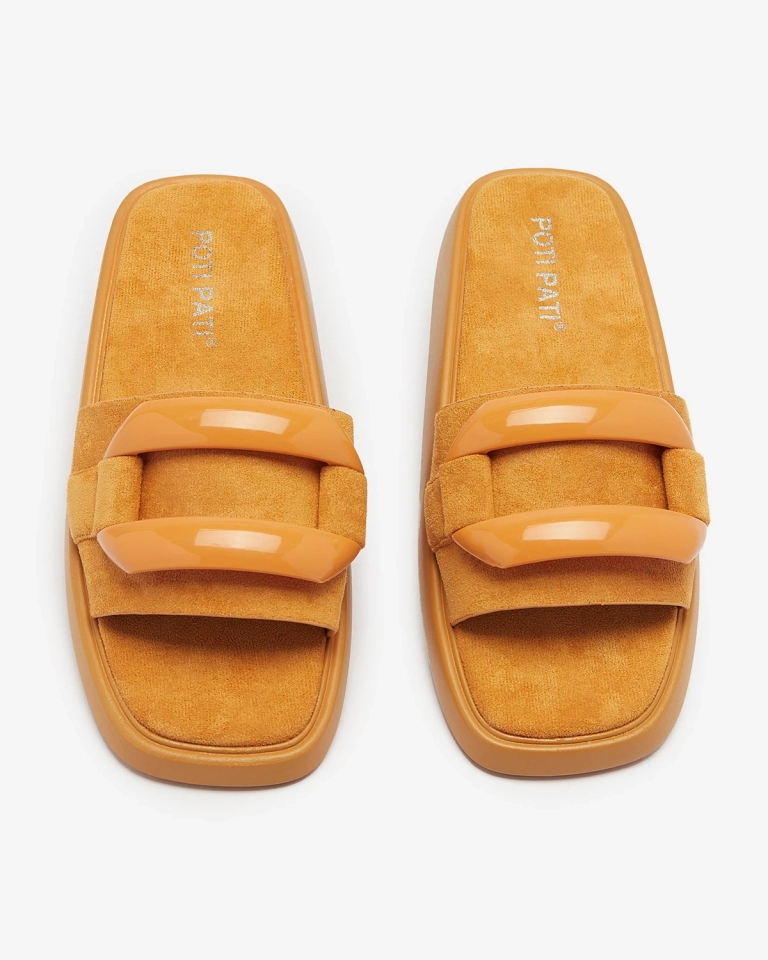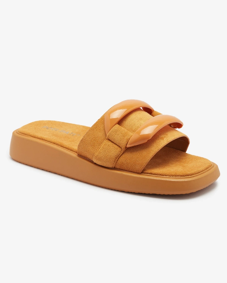 - Стильные женские шлепанцы на плоской подошве с большим пластиковым украшением - отлично сочетаются с широкими брюками и коротким топом! Ремешок и стелька из эко-замши, квадратный нос, резиновая подошва.