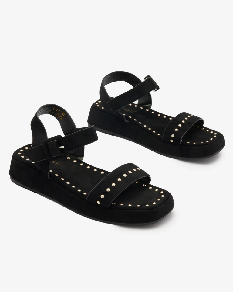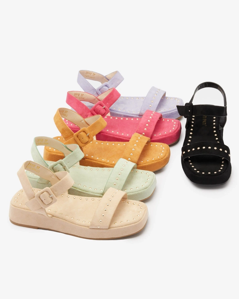 - Женские сандалии на толстой подошве, выполненные из органической замши. Модель украшена стразами, застегивается на пряжку. Удобная женская обувь для лета!