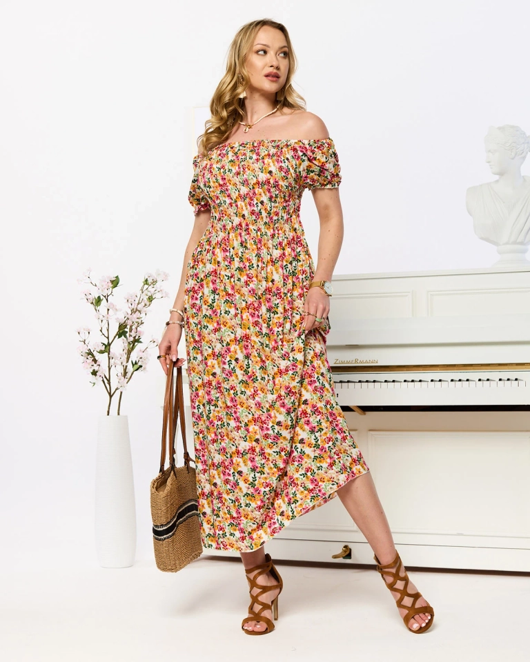 - Летнее женское платье длины миди, выполненное из хлопковой ткани с цветочным узором. Модель с круглым вырезом а'ля шишпанка и эластичной резинкой по ширине бюста и талии. Модель с короткими рукавами. Носите с сандалиями! ПРИМЕЧАНИЕ: Точность измерения (+/
