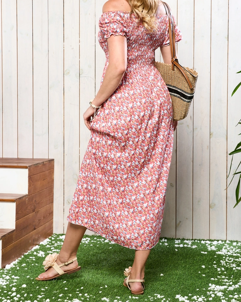 - Модное женское платье с открытыми плечами a'la hiszpana. Модель выполнена из легкой, воздушной цветочной ткани. На высоте бюста широкая, тянущаяся резинка. Изделие длины миди имеет короткие рукава. ПРИМЕЧАНИЕ: Точность измерения (+/-) 1 см