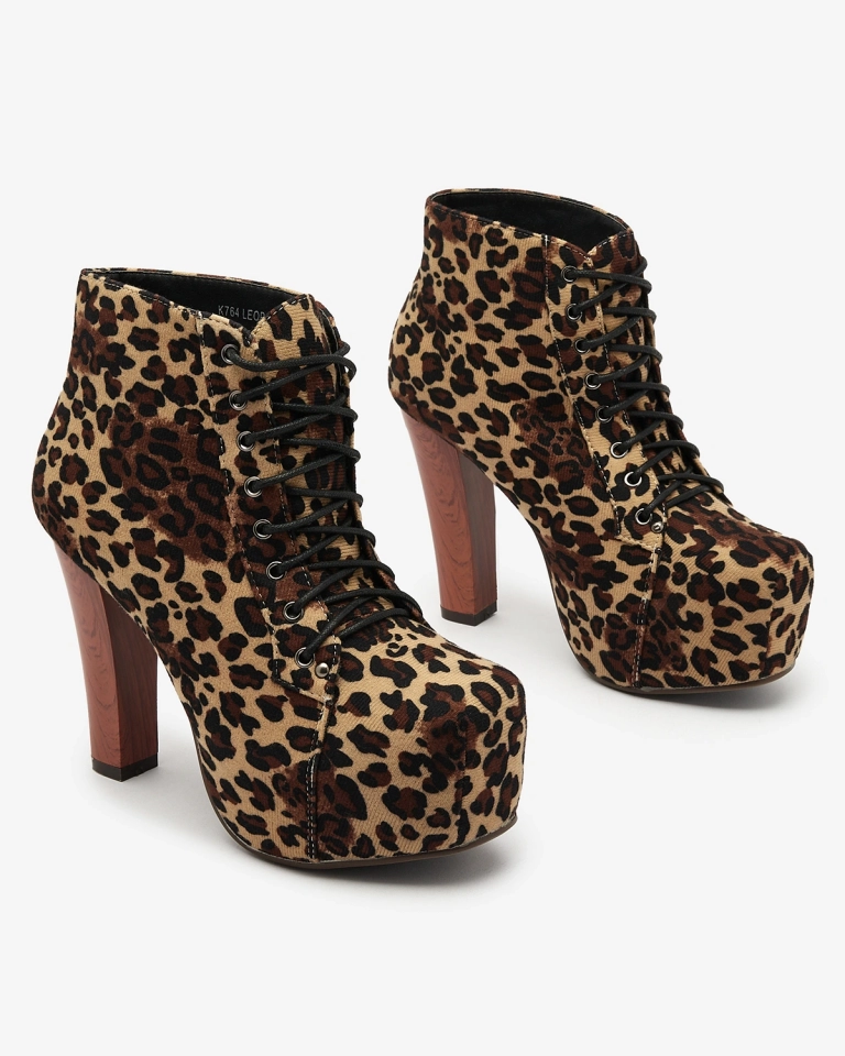 - Эффектные женские ботинки на высокой шпильке и платформе с леопардовым принтом. Верх на шнуровке из тканевого материала, внутри стелька из экокожи. Эта пара - сочетание вечной элегантности и современных тенденций.
