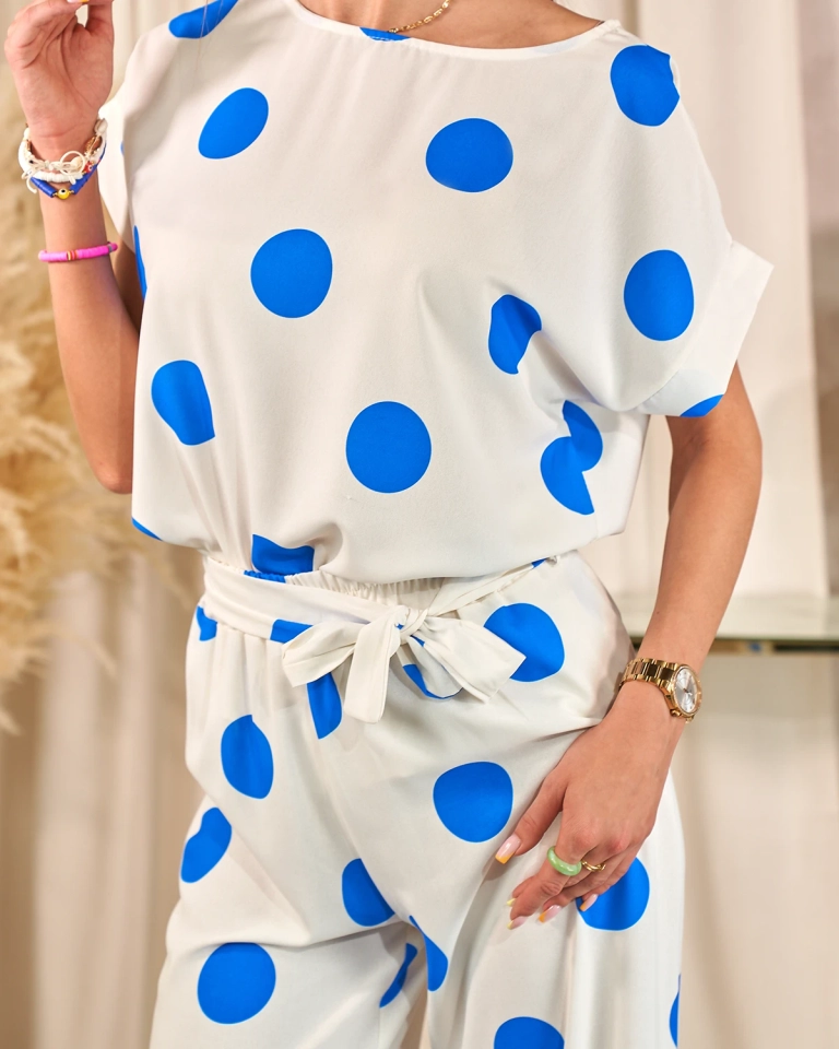 - Женский комплект из приятной, легкой ткани в горошек. Блузка имеет короткие рукава и круглый вырез. Тканевые широкие брюки оснащены эластичным поясом. Кроме того, в комплект входит тканевый пояс. ПРИМЕЧАНИЕ: Точность измерения (+/-) 1 см.