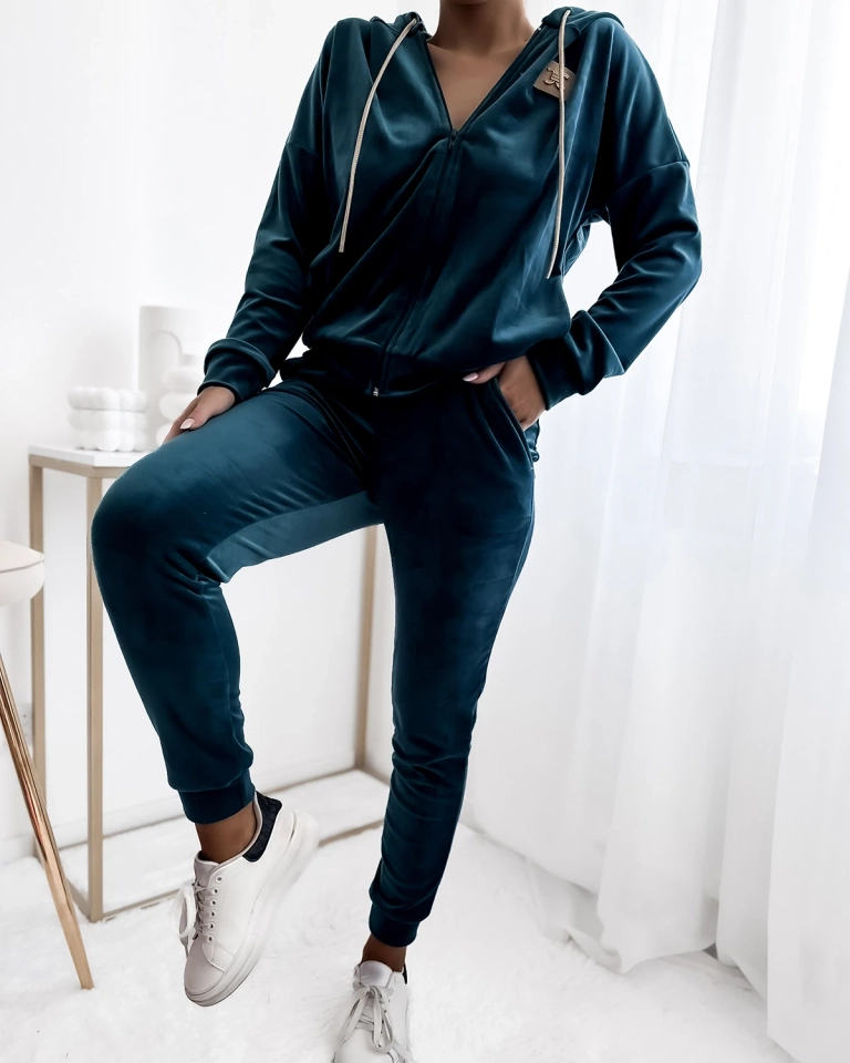 - Женский комплект толстовок из мягкого материала а'ля велюр. Толстовка украшена нашивкой, имеет капюшон, завязки на штанинах и 2 кармана. Брюки с широким эластичным поясом и 2 накладными карманами. ПРИМЕЧАНИЕ: Точность измерения (+/-) 1 см.