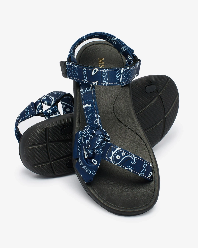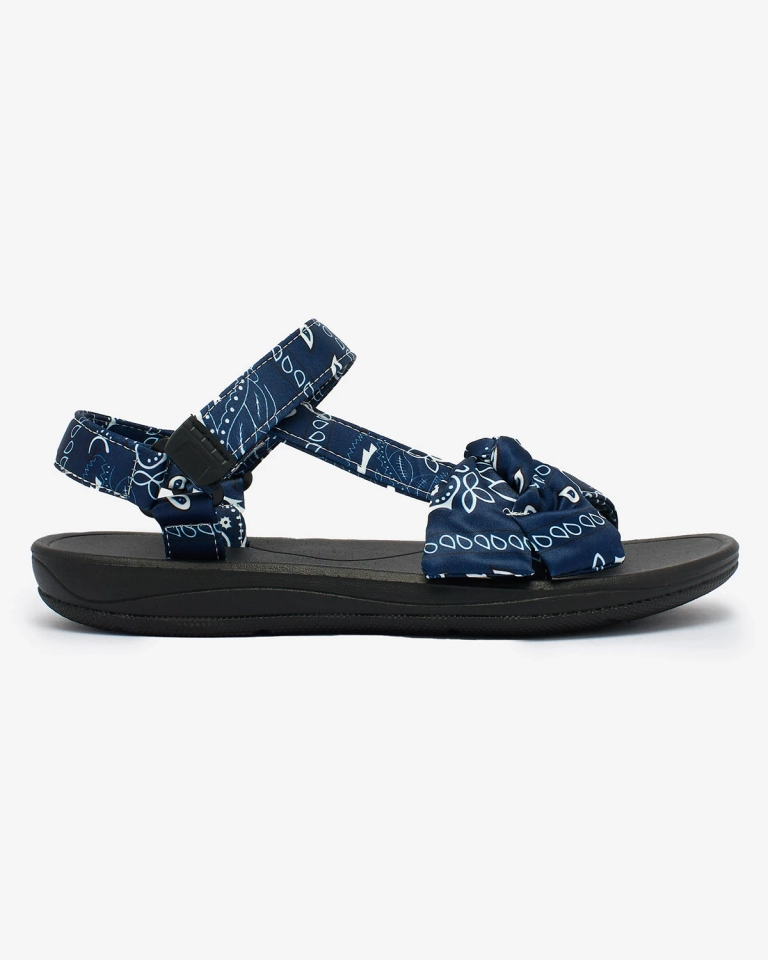 - Спортивные женские сандалии на резиновой подошве. Ремешки выполнены из тканевого материала с принтом и украшены бантиком. Представленная женская обувь застегивается с помощью ремешков на липучках. Они хорошо прилегают к ноге!
