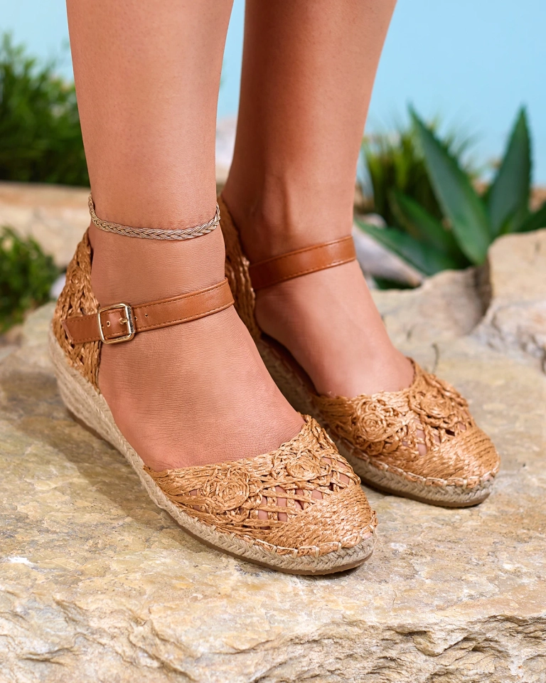 - Плетеные женские сандалии на каблуке из ткани и стельки из экокожи. Модель с открытой пяткой, застегивается на пряжку и имеет подошву, украшенную джутовым шнуром. Идеальны для создания оригинальных нарядов!