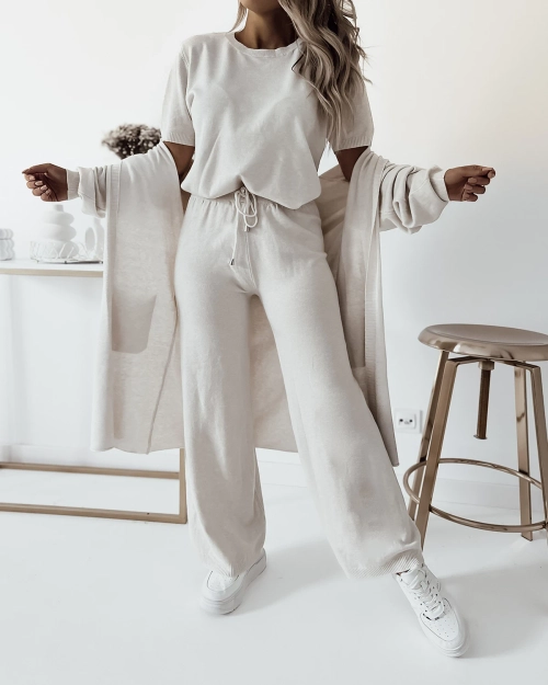 - Откройте для себя абсолютный комфорт и стиль в этом комплекте из трех предметов. Он состоит из кардигана с капюшоном и карманами, широких брюк из ткани и свитера с короткими рукавами - все из приятной на ощупь ткани. ПРИМЕЧАНИЕ: Точность измерения (+/-) 1