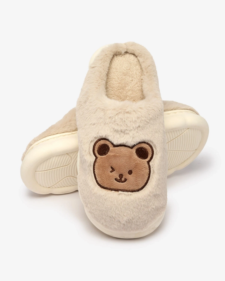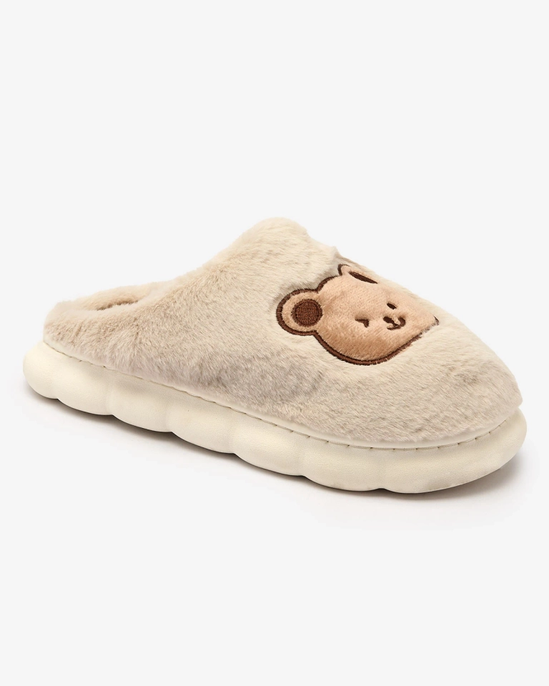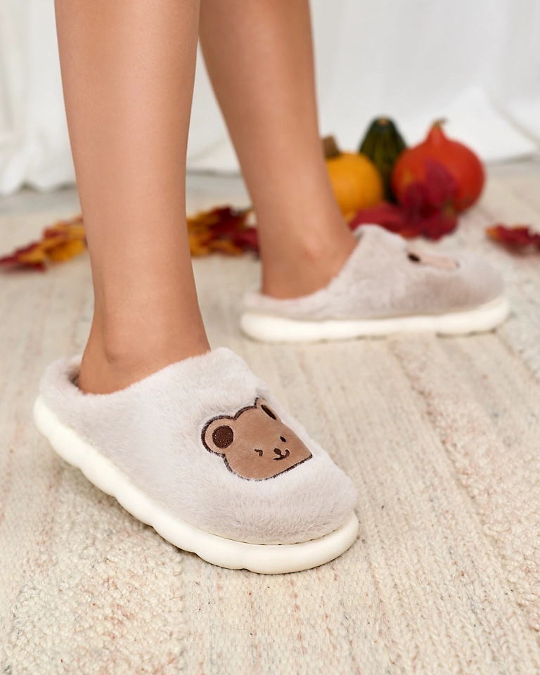 - Уникальные женские тапочки на плоской подошве, украшенные нашивкой с мишкой. Модель выполнена из материала, имитирующего мех. Отличный вариант для домашних нарядов!