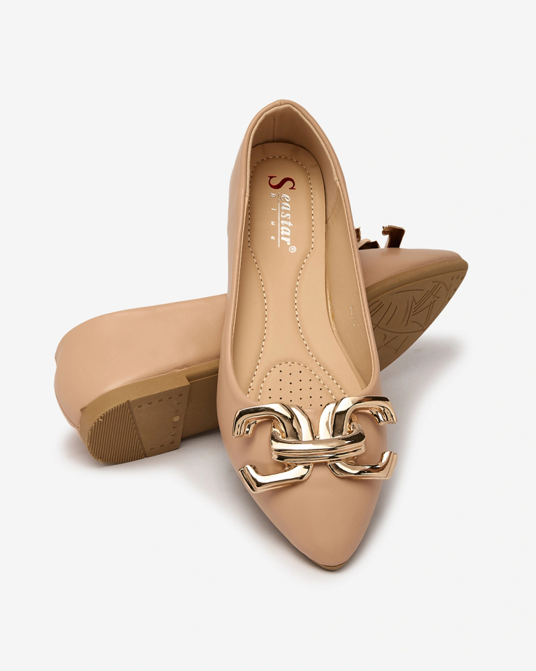 • Женские балерины на плоском каблуке, полностью изготовленные из экологически чистой кожи. Заостренный нос и украшение в виде металлической пряжки. Отличное дополнение к вашим повседневным нарядам!