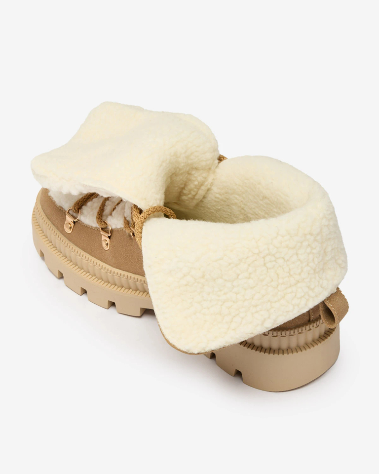 - Стильные женские ботинки-трапперы на шнуровке идеально подходят для холодных дней. Верх выполнен из комбинации экокожи нубук и мягкой овчины. Внутренняя часть также утеплена овчиной, что делает их не только модными, но и теплыми.