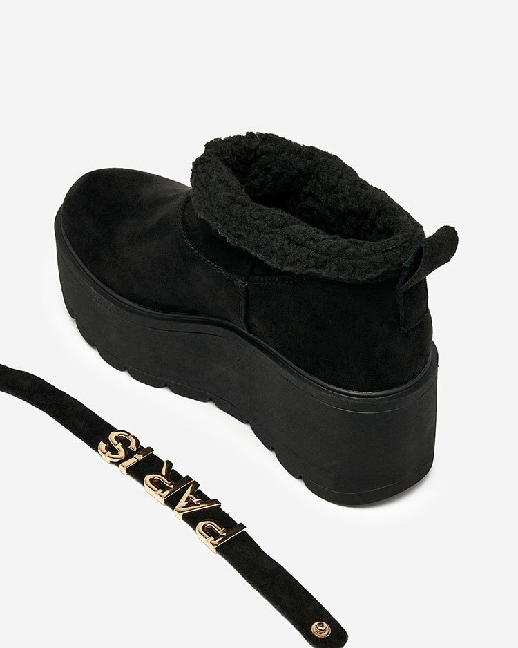 • Мега стильные женские утепленные сапоги из экологичной замши. Они имеют центральную часть, заполненную мехом а'ля овчина. Кроме того, съемный таз украшен надписью. Ботинки на высокой платформе - идеальный вариант для зимних повседневных нарядов!