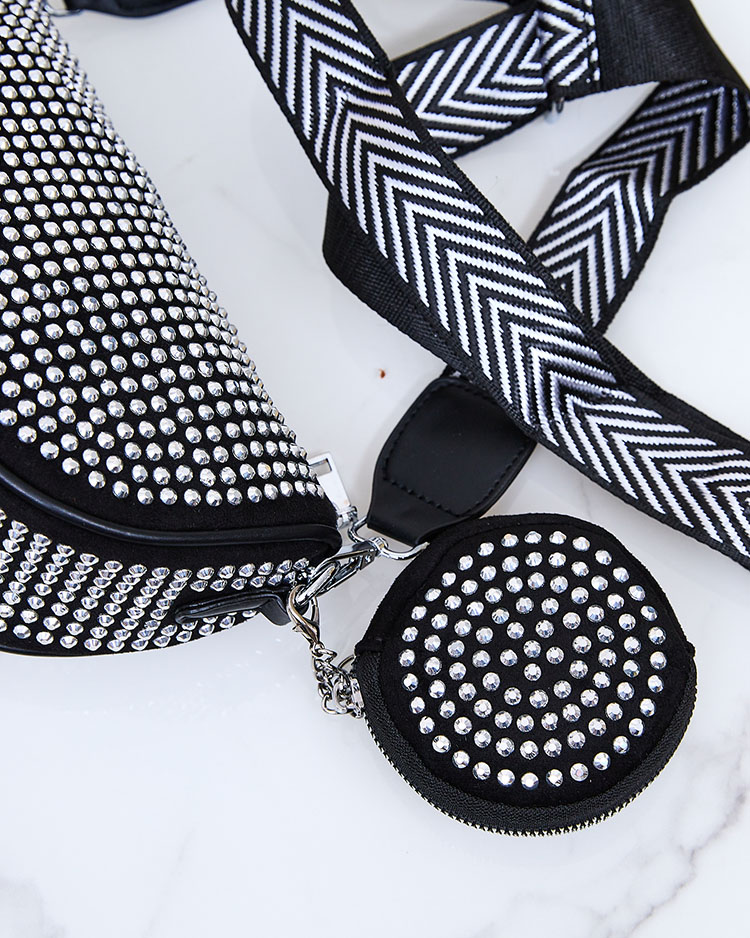 - Небольшая женская сумочка из экологичной замши с декоративными блестящими стразами. Сумочка имеет 1 отделение и 1 внутренний карман. Кроме того, имеется съемный регулируемый ремешок и чехол. Модель закрывается на молнию.