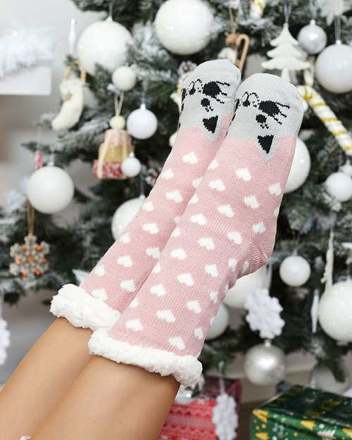 • Красивые женские толстые носки, отделанные рождественским рисунком с нескользящим низом. Внутри утеплены белой теплой овчиной. Носки отлично подойдут для холодных вечеров.
