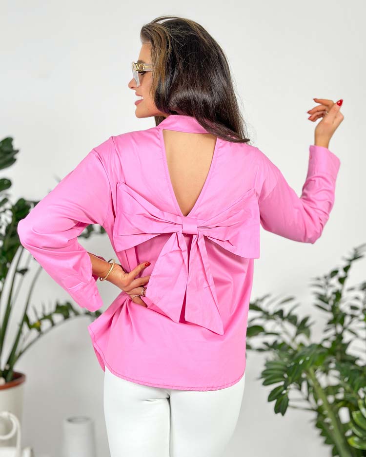 - Сенсационная женская рубашка с рукавами 3/4. Модель с отложным воротником, застегивается на пуговицы и имеет большой бант на спине. Обязательно должна быть в гардеробе каждой женщины!