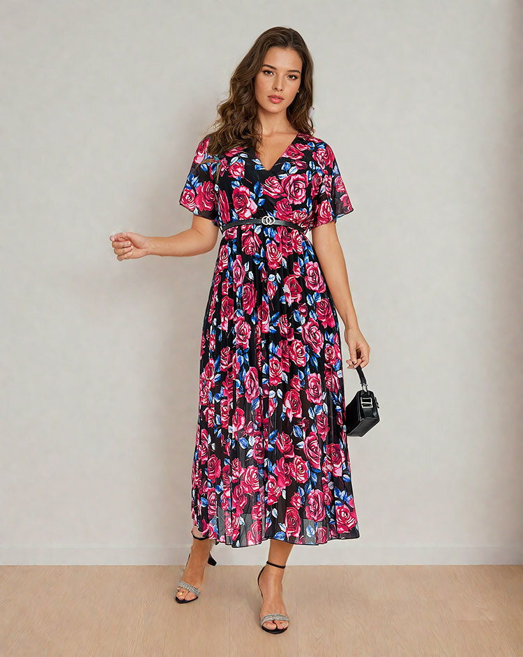• Уникальное женское платье из легкой ткани с цветочным узором. На высоте талии оно имеет резинку. Изделие имеет длину миди, короткие рукава и плиссированную отделку. Кроме того, в комплект входит пояс. Почувствуйте лето в этой модели!