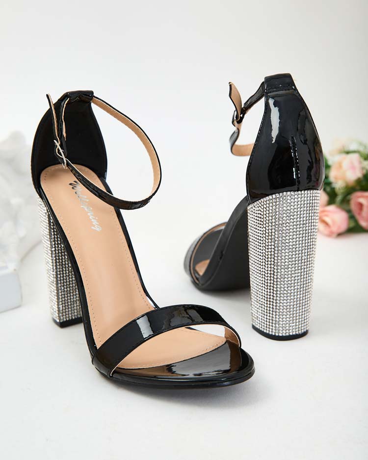 - Сандалии из лакированной экологичной кожи на высокой стойке, застегивающейся на пряжку. Сочетание стиля и комфорта. Массивный каблук, украшенный цирконами, придает уверенность шагу. Идеальны для любого случая!