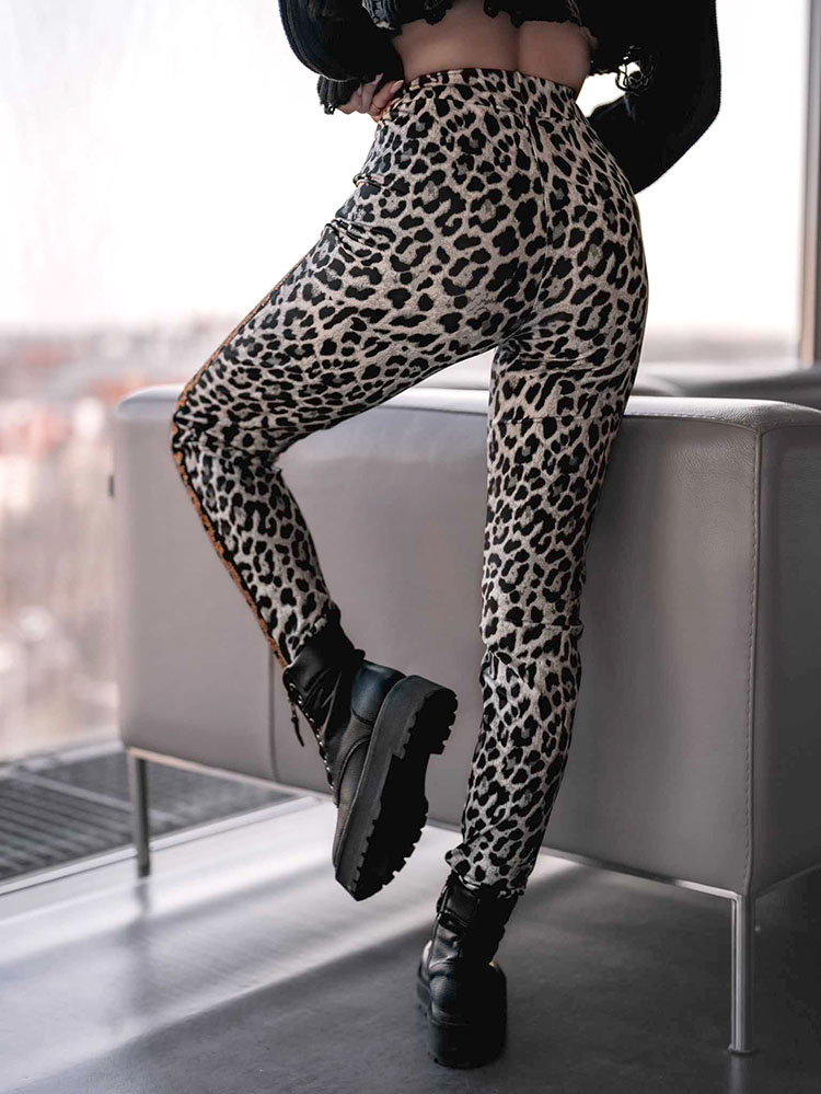 • Стильные леггинсы из эластичной ткани. Широкий эластичный пояс обеспечивает комфорт при носке. Все украшено животным принтом и цирконами. Отлично подойдут для создания стильных нарядов!