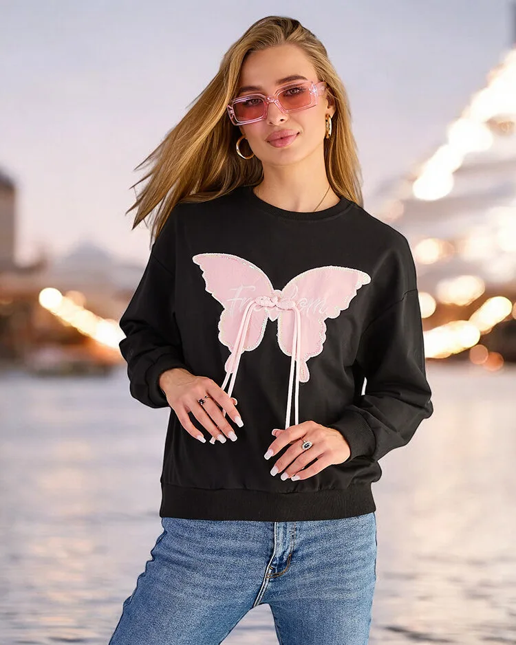 - Добавьте изюминку своим нарядам с помощью нашей тонкой толстовки, украшенной нашивкой с бабочками. Надевается через голову, имеет круглый вырез и длинные рукава. Идеально подходит на каждый день, когда вы хотите чувствовать себя непринужденно, но стильно!